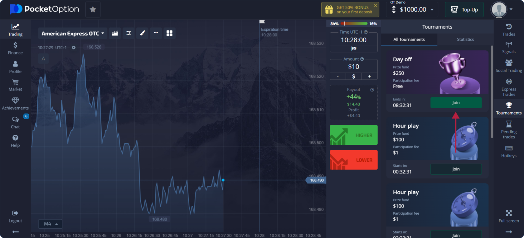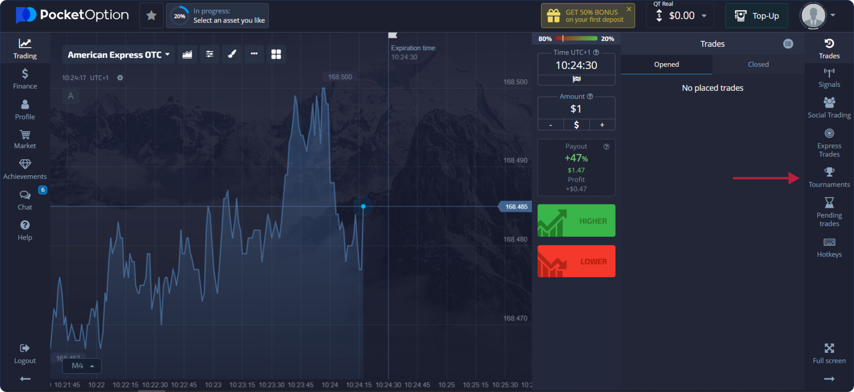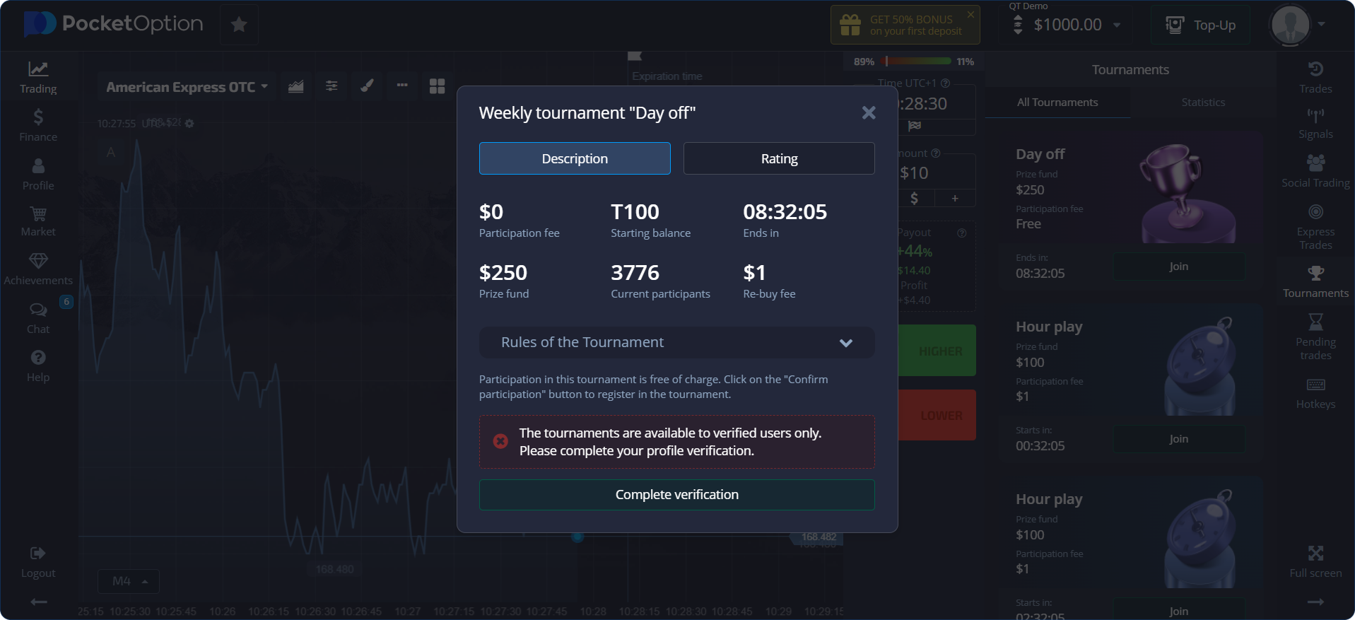 Turnamen di platform Pocket Option terdiri dari grup tertutup pengguna yang berdagang dengan aset yang sama dan memiliki saldo awal yang sama. Pemenangnya adalah yang mencapai keuntungan terbesar. Biasanya, tergantung pada pengaturan kompetisi, tiga peserta terbaik akan mendapat penghargaan dalam bentuk hadiah uang. Transaksi dilakukan dengan saldo virtual, yang berarti dana dalam akun nyata tidak digunakan selama berpartisipasi dalam kompetisi.